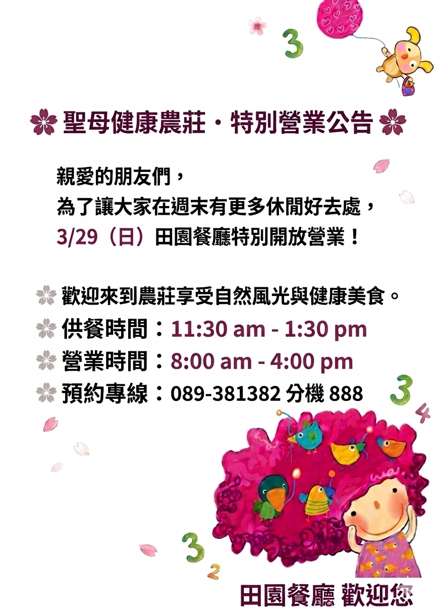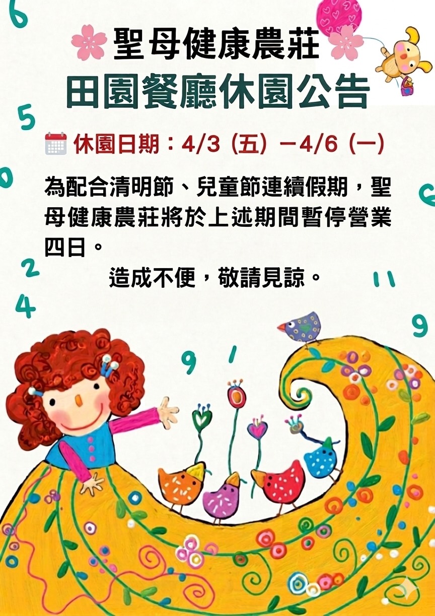 2/14-2/22 年假期間聖母健康農莊休園,田園餐廳採預約制,40 人以上訂位即啟動服務(午晚餐均可)。
