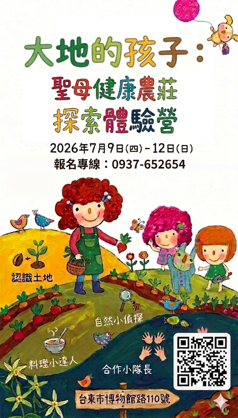 🌿 2026 聖母健康農莊「探索體驗營」報名開跑!讓孩子回到土地,成為大地的孩子,寫下難忘的生命印記!【活動亮點】五大任務: 認識土地、料理達人、自然偵探、合作隊長、健康生活家。豐富行程: 走讀農莊、烘焙手作、樹冠層體驗、原民風味餐、夜間觀察。【活動資訊】日期: 2026/7/9 (四) ~ 7/12 (日)對象: 新學期升四至升七年級學生(限額 20 位)地點: 台東聖母健康農莊(台東市博物館路110號)費用: 6,800元💰 早鳥優惠: 6/1 前報名享 5,500元。👭 兩人同行: 一起報名不須早鳥亦享 5,500元/人。【家長重要提醒】成果發表: 7/12 (日) 12:00 歡迎家長參與午宴及發表會。交通接駁: 提供 7/9 報到及 7/12 賦歸之台東火車站/機場接駁。🔗 立即線上報名:👉 https://www.beclass.com/rid=30525d169a92635ec349📞 活動諮詢: 0937-652654 王主任✨ 邀請孩子走進自然,體驗從農田到餐桌的真實感動! ✨